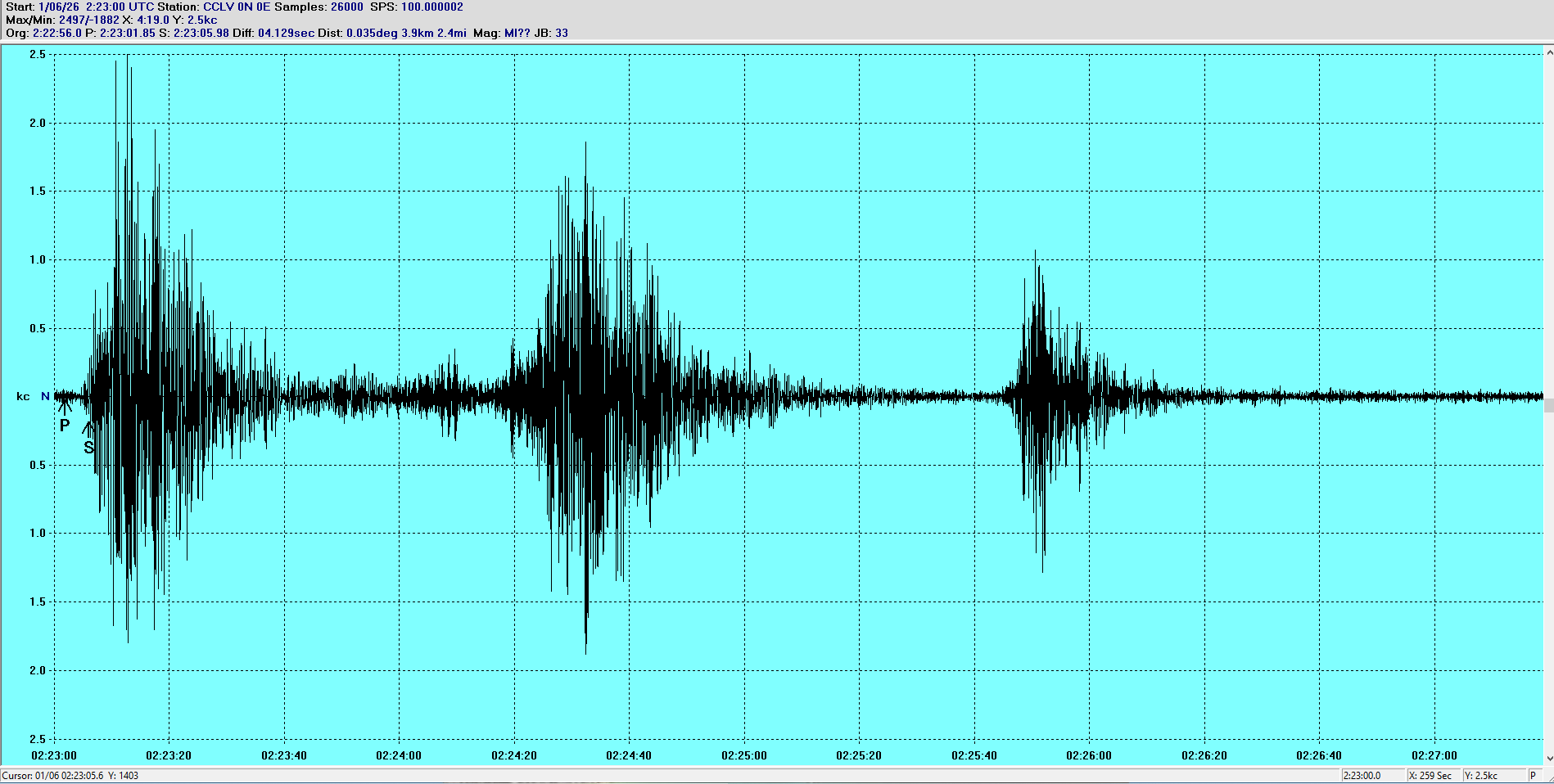 Campi Flegrei, Solfatara, md 3.1 ore gmt 02:23:02, md 2.9 ore gmt 02:24:19 e md 1.6 ore gmt 02:25:44 del 06/01/2026 prof. 3 Km, dati Ingv, registrazione sismica stazione amatoriale di Calvizzano ik8scr.