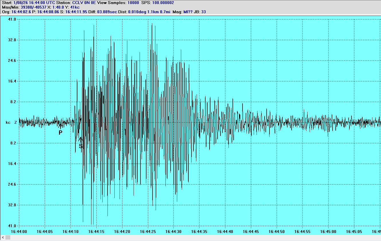Campi Flegrei, md 2.6 ore gmt 16:44:08 del 08/01/2026 prof. 3 Km, dati Ingv, registrazione sismica stazione amatoriale di Calvizzano, ik8scr.